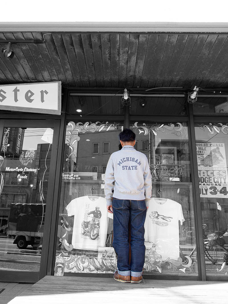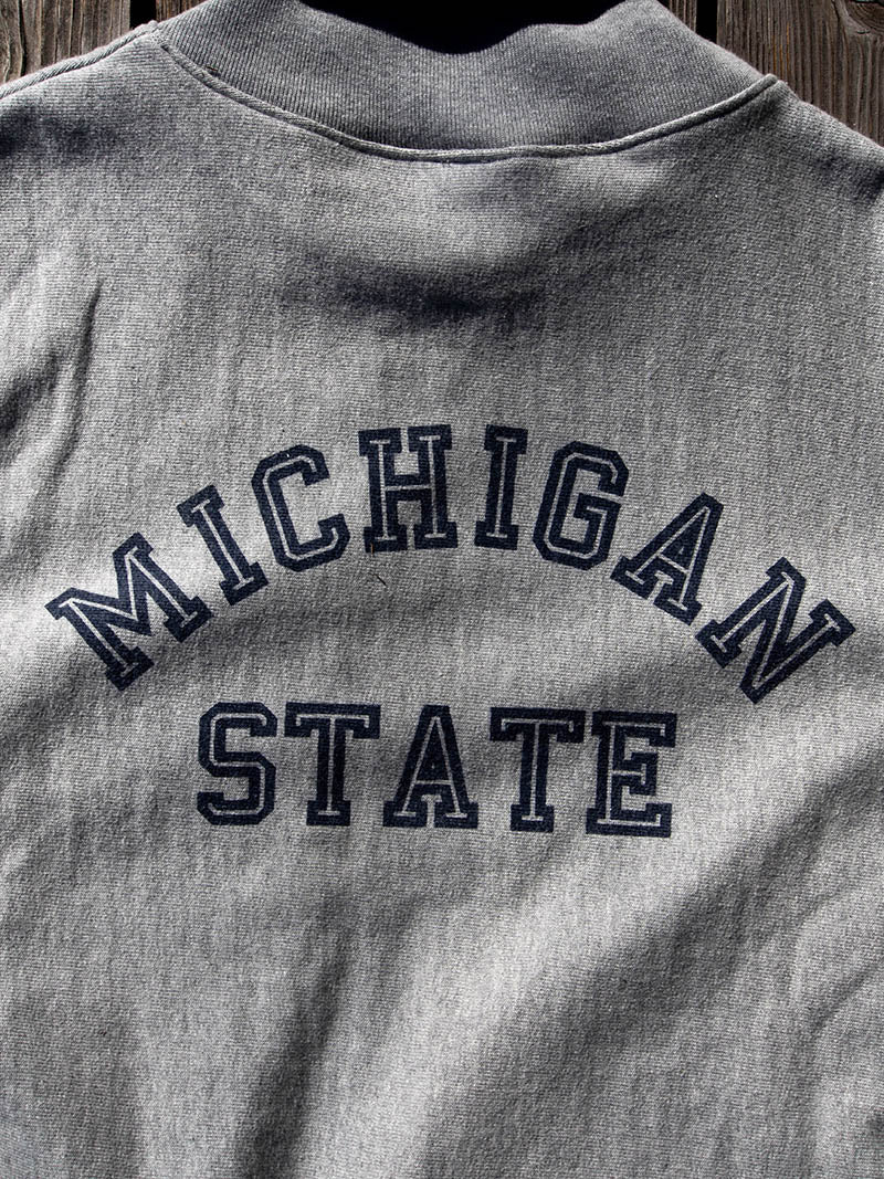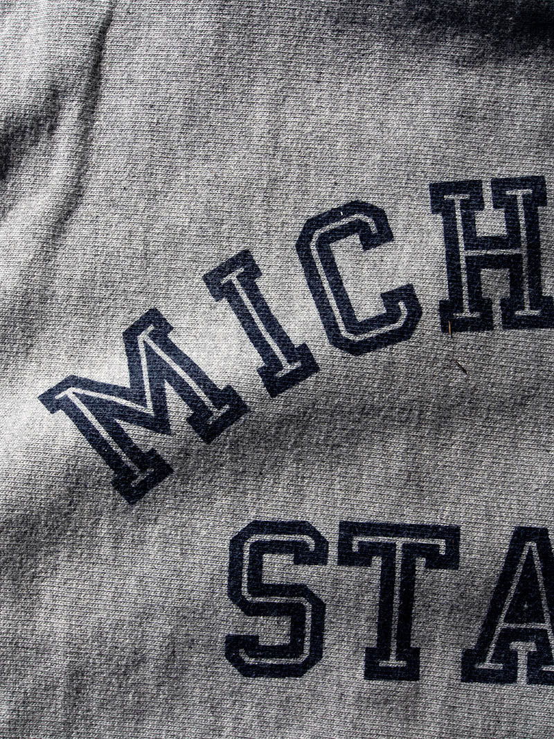 古着の定番でもあるアーチ状のカレッジロゴ。80年代ミシガン州立大学のチームスウェットをイメージし再現。