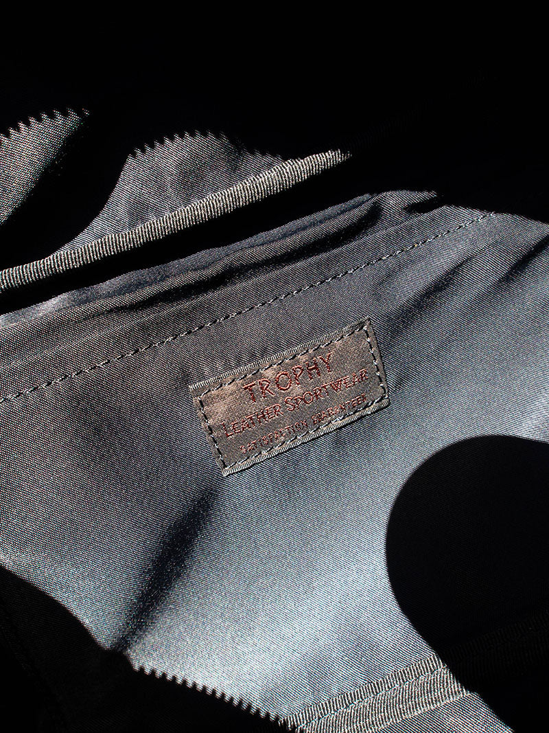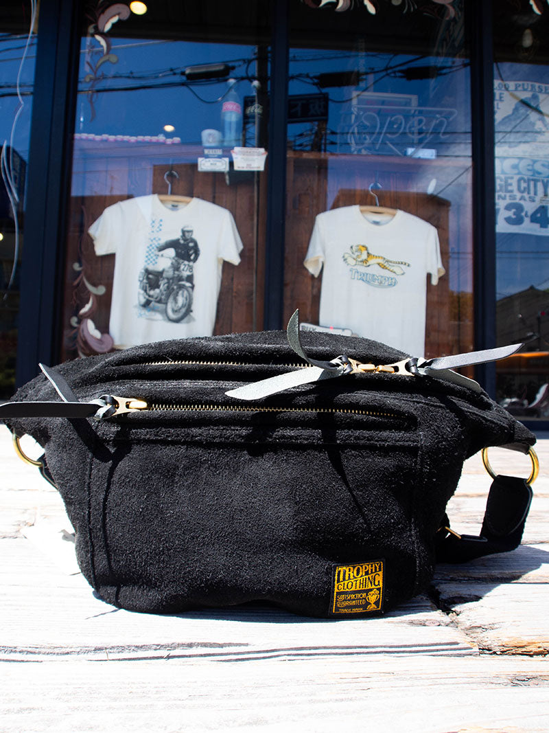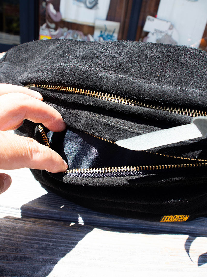 メインジップは両開き仕様で、グローブを装着したままでも扱いやすいようレザーストラップを付属しています。