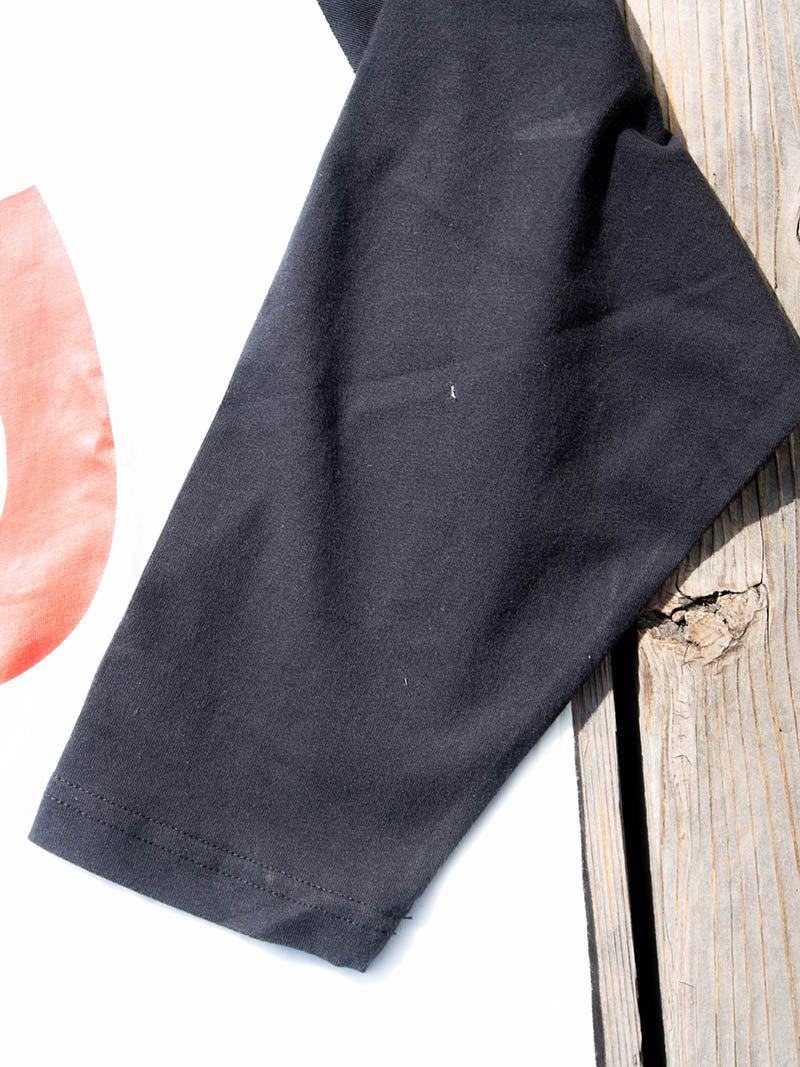 この生地は、芯にポリエステル、外側を綿でカバーリングしたコアヤーンという特殊な糸を使って編み上げられています。そのため、綿本来の自然な肌触りを保ちながら、ポリエステルの持つ速乾性と耐久性を実現。OE天竺ならではの粗野でヴィンテージライクな風合いも魅力です。見た目は綿でありながら、機能的な快適さを実現した一枚に仕上がりました。