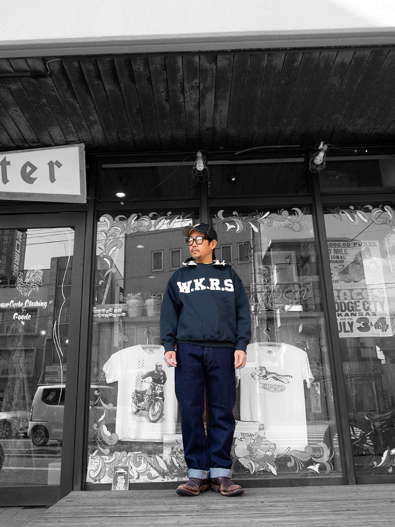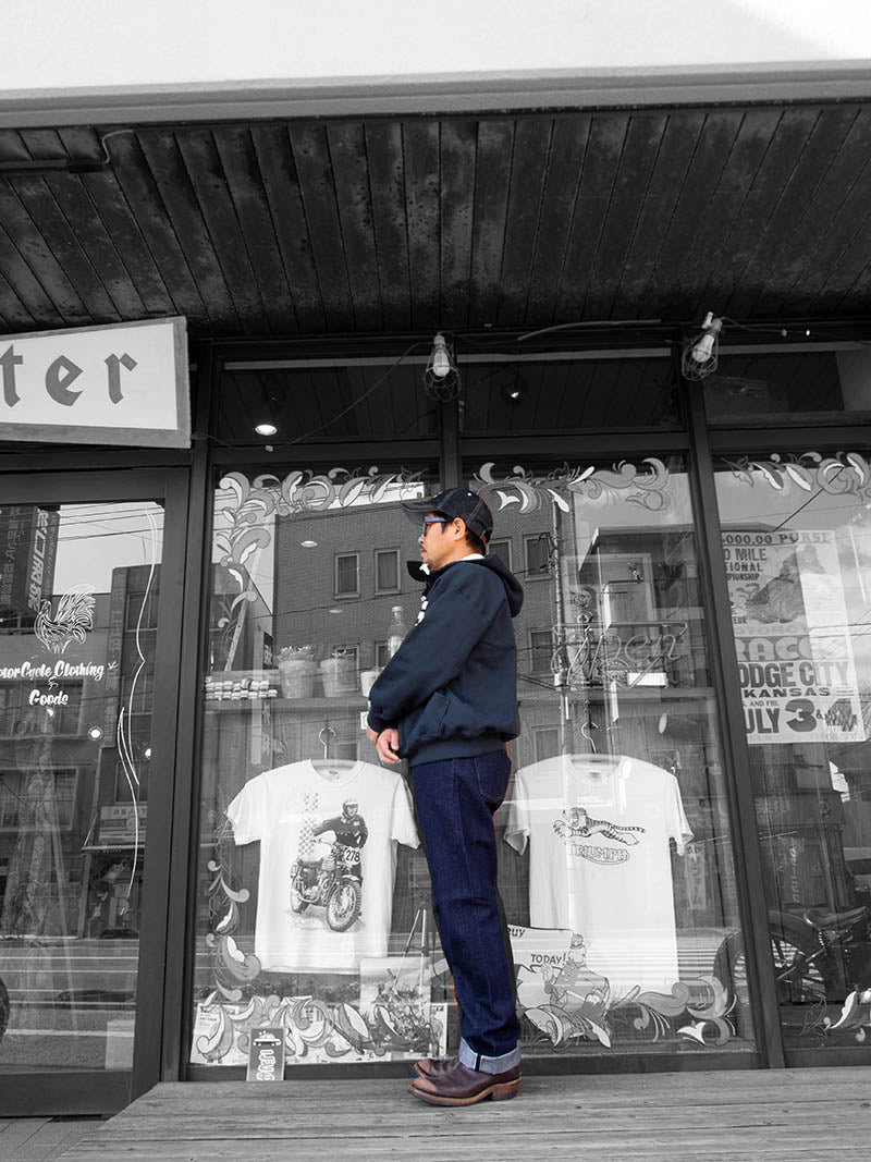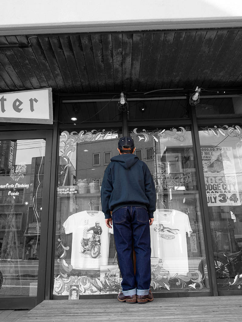 パターンはストレートLot801とスリムテーパードLot802の二型。 裾から10センチ程度は裾幅を同寸にしているので、レングス30インチ程度までは裾上げしても裾幅が変わりません。 縫製はすべて綿糸。脇の割、左右の身頃を合わせる通称「小股」、ヨーク、帯付けは太番手の糸を使っています。綿糸で強度を出すための仕様ですが、これが結果としてセルビッジのデコボコとしたアタリ、ヨークの強いパッカリングを生んでくれています。