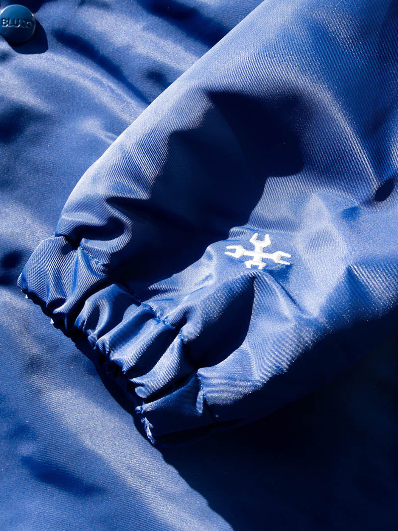 BLUCOの人気オリジナルコーチジャケットに、DOGTOWNのエンブレム刺繍とMOONEYESパッチをあしらった特別仕様のトリプルコラボレーションアイテム。