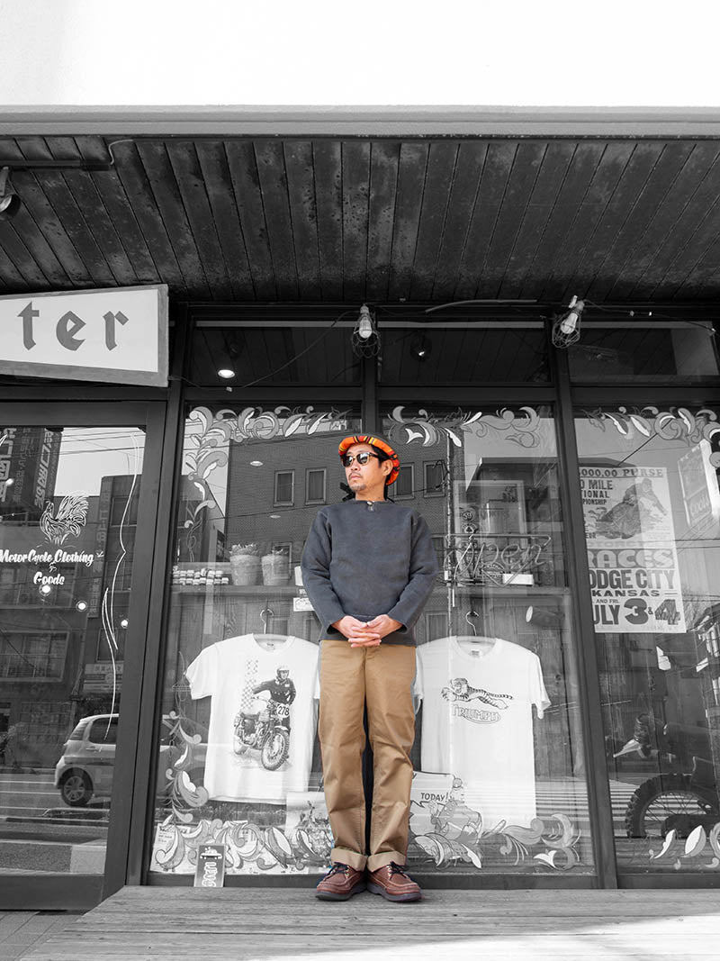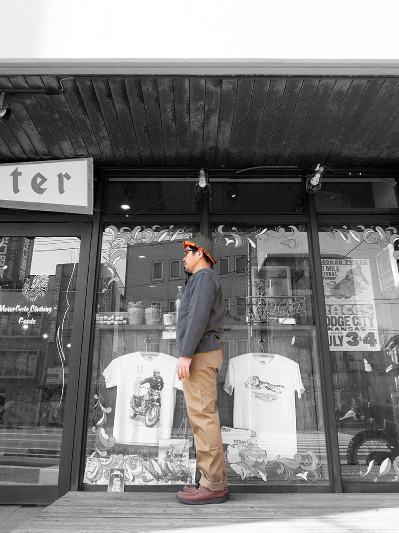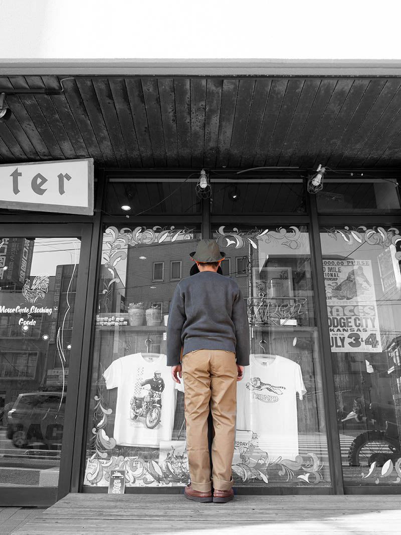 チノはWORKERS 別注のUSMC Khaki が一色。少し黄土色っぽい、ベージュではない。
