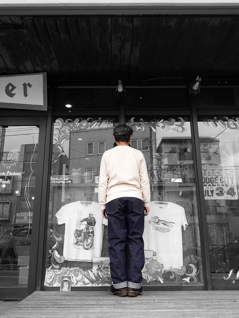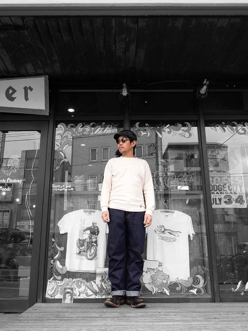 緯糸に茶綿を使用したセルビッチデニム『JUMBO DENIM』を使用した、ベーシックな王道ストレートシルエットのジーンズ。『ジーンズの原型』ともいえる基本のストレートシルエットをベースにヒップ周りを日本人の体型に合わせて補正。腰回りに自然なフィット感を持たせながらも、裾にかけて無骨に落ちるラインは、クラシックさと現代的な美しさを兼ね備えています。細部の仕様は隠しリベットや中盛りループなどヴィンテージディテールを踏襲しつつ、日常的に穿きやすいバランスに調整。長く付き合える“最良のベーシック”として、初めての一本にも、既にジーンズを愛する方のワードローブにもふさわしい仕上がりです。