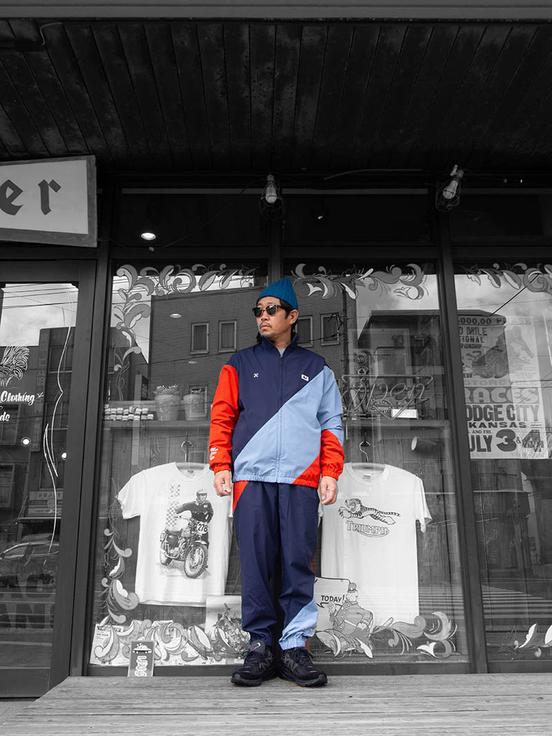 同素材のトラックジャケットとのセットアップもおすすめです。
