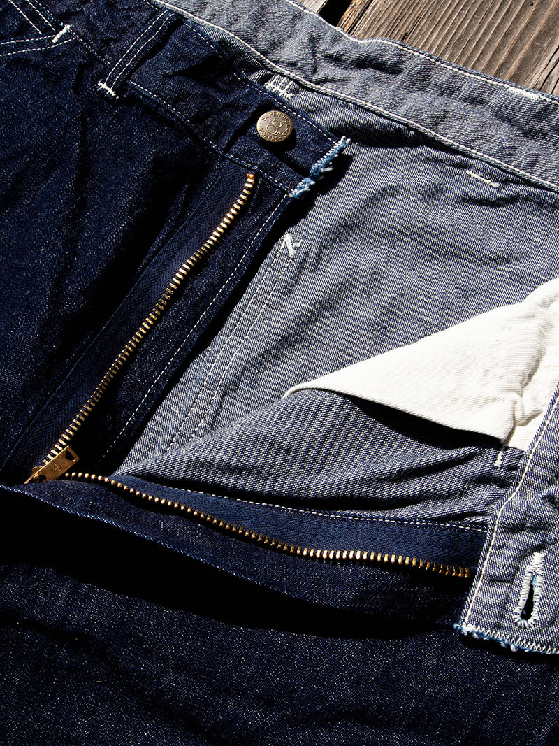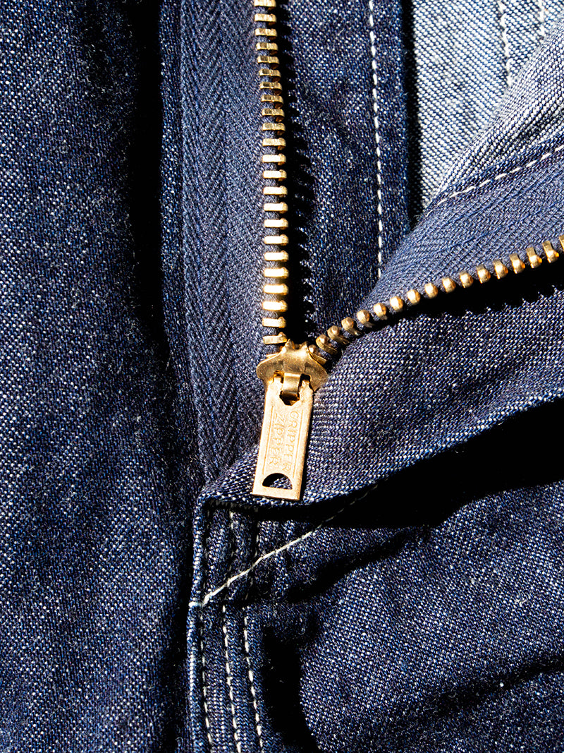 10オンスデニム、自然なムラ感のある糸を使ったもの。使う所は無いのですが、わざわざ耳付き生地を使っています。
